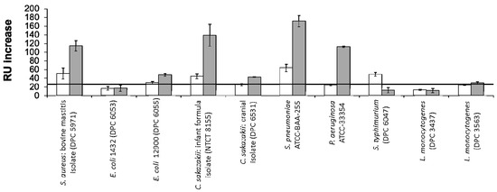 RU changes following exposure of a panel of pathogenic bacteria to LF from colostrum (white) or mature milk (grey) immobilised on a Biacore SA chip. E. coli P1432 was identified as a negative control and its response was marked as the minimum requirement for consideration as a positive interaction (black horizontal line). All bacteria were applied at a concentration of 1 × 108 CFU·mL−1.