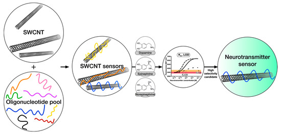 Strategy to measure and optimize selectivity and sensitivity of neurotransmitter sensors. Candidate sensors are synthesized from single-walled carbon nanotubes (SWCNTs) and DNA oligonucleotides and their responses to the neurotransmitters dopamine, epinephrine and norepinephrine are quantified. Crucial for the success of these sensors is the discrimination between different, but chemically very similar, neurotransmitters. In this work, a set of different DNA-oligonucleotides is tested as an organic phase and corresponding sensor properties, such as Kd-values, are evaluated to find the most selective and robust sensors.