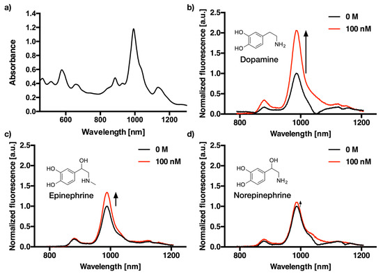 Absorbance and fluorescence spectra of DNA-dispersed single-walled carbon nanotubes (SWCNT). (a) VIS-NIR absorbance spectra of (GT)10-dispersed SWCNT. (b) NIR-fluorescence emission spectra of (GT)10-dispersed SWCNT after the addition of 0 M (black) and 100 nM dopamine (red). (c) NIR-fluorescence emission spectra of (GT)10-dispersed SWCNT after the addition of 0 M (black) and 100 nM epinephrine (red). (d) NIR-fluorescence emission spectra of (GT)10-dispersed SWCNT after the addition of 0 M (black) and 100 nM norepinephrine (red).