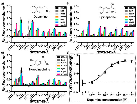 Dose-response curves of different catecholamine SWCNT/DNA sensors. Relative fluorescence change of the sensors upon addition of increasing concentrations (0, 100 pM, 1 nM, 10 nM, 100 nM, 1 μM, 10 μM, 100 μM) of dopamine (a), epinephrine (b), and norepinephrine (c). The x-axis shows different DNA sequences used to functionalize the SWCNTs. Here, the (6,5)-SWCNTs responses were evaluated. Errors are standard deviations (n = 3). (d) An example dose-response plot for dopamine recognition of SWCNT-(GT)10. Errors are standard deviations (n = 3).