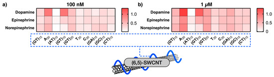 The data shown in Figure 3 contains all the information to evaluate sensor performance. The first and most obvious observation is that almost all SWCNT-DNA sensors react upon exposure to dopamine, epinephrine, and norepinephrine with an increase in NIR fluorescence. A30, (GT)10 and (GT)20 show the largest relative fluorescence increase for dopamine and epinephrine, while (GT)10-dispersed SWCNT only react minimally to norepinephrine. Interestingly, SWCNT-(AT)15 does not show any change in fluorescence in case of dopamine and norepinephrine and only a small change to epinephrine. However, for most analytical tasks it is important to consider relevant concentrations. For example, the maximum concentration of 100 μM used in these assays is high and will most likely not be reached (for long periods of time) in biological scenarios [34]. All sensors respond to catecholamines with different magnitudes and they saturate at different concentrations. Therefore, it should be possible to discriminate between different neurotransmitters at concentrations << 100 μM (see Figure 3).