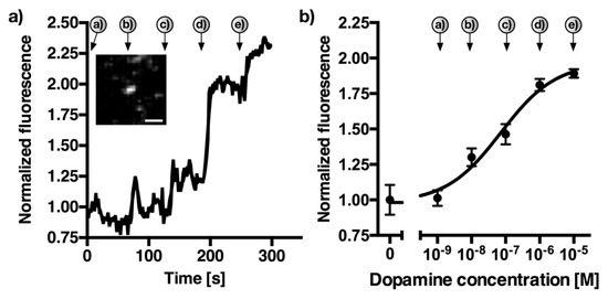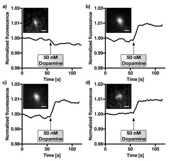Nanomaterials are promising building blocks for neurotransmitter sensors/probes [1]. Among the different materials carbon nanotubes attract a lot of interest due to their unique optoelectronic properties. Semiconducting single-walled carbon nanotubes have a bandgap that leads to near infrared (NIR) fluorescence [16]. SWCNTs can be non-covalently decorated with an organic phase generating the desired specificity for the molecular target. Examples for sensors of this class range from small molecule analytes, like neurotransmitters, sugars, and explosives, to miRNA or proteins [17,18,19,20,21,22,23]. These sensors combine specificity for the target generated by the organic corona-phase and the advantageous properties of SWCNTs for optical sensing and imaging [16,24,25,26]. These advantages are, among others, the extraordinarily high photostability compared to organic fluorophores, the absence of fluorescence blinking, as well as the large Stokes-shift of >400 nm allowing for low-background imaging in the biologically-transparent near-infrared (NIR) window [16]. Such reversible sensors have been used to detect the efflux of dopamine from cells by imaging many of them at the same time [5]. This approach enabled a spatial resolution that was not possible before with electrochemical approaches.