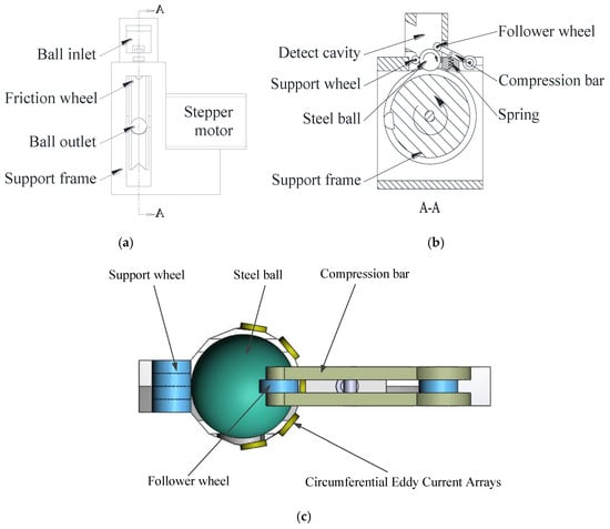 The requirements for the surface defect inspection of steel balls were met by using a one-dimensional unfolding method to realize the full expansion of the steel ball. The unfolding mechanism of the steel ball is shown in Figure 1, which was mainly comprised of supporting, follower, and friction wheels, and a CECA sensor. The tested steel ball regularly entered into the inspection cavity through the ball inlet from a feeding system.