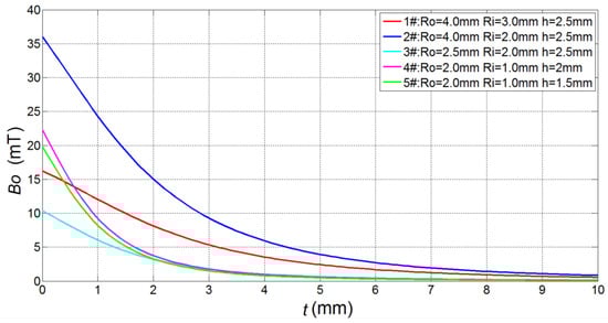 Then, the Bo–t (the relationship between the magnetic induction intensity and lift-off) curves of the five different parameter coils were plotted (Figure 3).