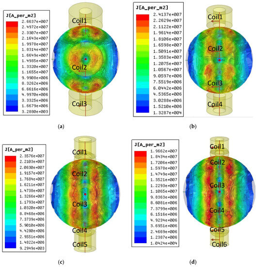 The eddy current distribution of the CECA sensor on the ball surface showed that the maximum eddy current density of the 3- and 4-coil probes was 2.6637 × 107 and 2.4137 × 107 A/m2, respectively, while that of the 5- and the 6-coil probes were 2.3576 × 107 and 1.9662 × 107 A/m2, respectively (Figure 7). Although the eddy currents induced by 3- and 4-coil probes were denser than that of the 5- and 6-coil probes, the distribution was not uniform. In particular, between adjacent coils, the minimum induction eddy current densities of the 3- and 4-coil probes were 3.288 × 103 and 1.3287 × 104 A/m2, respectively, which was a disadvantage for quality inspections of steel ball surfaces. The induced eddy current densities of 5- and 6-coil probes were uniform, but the induced eddy current density of the 5-coil probe was larger than that of the 6-coil probe. Therefore, the 5-coil probe was chosen as the optimal coil arrangement in this study.