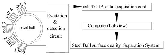 The Aviko series automatic inspector (Sorting Solutions Ltd., Bílina, Czech Republic) mainly uses a combination of vibration, photoelectric, and eddy current sensors to inspect the surface and subsurface qualities of steel balls [2]. A double-probe eddy current sensor has been used to scan and inspect steel ball surfaces, with two probes symmetrically arranged at 180 degrees on the testing mechanism outside of the steel ball [1]. An instrument composed of several electromagnets and a ring-shaped capacitive sensor has been designed, yielding an instrument capable of inspecting surface defects 0.05 mm in diameter and 0.01 mm in depth on a 4 mm diameter steel ball bearing [3]. A visual inspection technique has been employed, with visual features providing a rapid means of inspection of single balls [4].