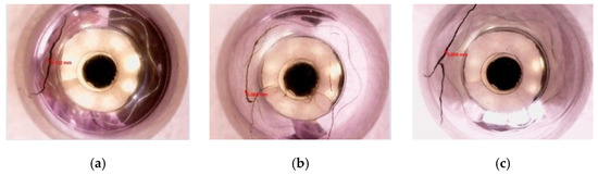 Samples of steel ball defects. (a) Linear cracks; (b) Arc cracks; (c) Cross cracks.