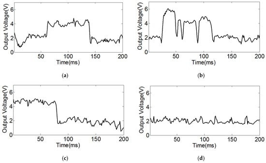 The inspection voltage curve. (a) The inspection curve of linear cracks; (b) The inspection curve of arc cracks; (c) The inspection curve of cross cracks; (d) The inspection curve of the steel ball without defect.