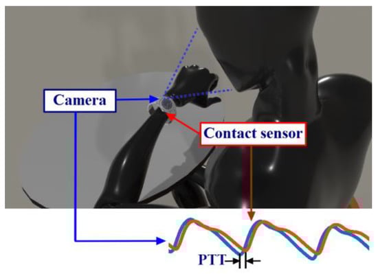 Use case of the ICPPG system (combination of contact photoplethysmography (cPPG) and imaging photoplethysmography (iPPG)). The ICPPG system can be implemented on a wristwatch with a contact photoplethysmography (PPG) sensor at the back side and a camera on the top. The pulse transit time (PTT) can be calculated by the temporal difference between the morphologic valleys of PPG signals at the wrist and the iPPG signal at the face.