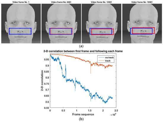 IPPG signal extraction and region of interest (ROI) selection. (a) An example of fixed ROI (blue block) and the tracking ROI (red blocks) with the increasing number of frames. It was found that the tracking ROI is able to adapt to the movement of the participant while fixed ROI cannot; (b) An example of the 2-D correlation between the skin within ROI and the original template of the skin that was selected in the first video frame vs. number of frames. It shows that the 2-D correlation of the skin within tracking ROI is higher and more stable than fixed ROI.