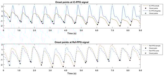 Estimating PTT requires the localization of a characteristic point in the waveform of the PPG signal. Zong et al. proposed a morphology-based method to detect the onset of ABP pulse [], showing a high accuracy in ABP beat detection when tested on different data sets [,,,,]. The algorithm is in cooperation with a resample technique (to 125 fps) to enhance temporal resolution. According the documentation of the resample in MATLAB, the resampling applies an antialiasing FIR lowpass filter to the original signal and compensates for the delay introduced by the filter. By employing the algorithm of ABP beat detection, the time difference between each two onset points (see Figure 3) caused by the same heartbeat (i.e., one from the iPPG and the other from the cPPG) were derived, the PTT value (called IC-PTT) can then be obtained per heartbeat. Similarly, the Ref-PTT values can be obtained using the reference PPG system with two cPPG sensors.