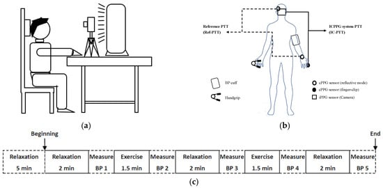 Before the experiment, each participant took a rest for five minutes. The experiment consists of five sessions with and without exercise as shown in Figure 4c, where each session started with PPG measurement during either a 2-min relaxation or a 1.5-min exercise, followed by BP measurement. The exercise session (corresponding to an increased BP) and the relaxation session (corresponding to a decreased BP) were performed alternately. For selecting the optimal type of exercise, several exercises were performed including cycling, jumping, and keep holding a handgrip. Since iPPG is less reliable with large motions, holding a handgrip was selected as the exercise to perform in this study.