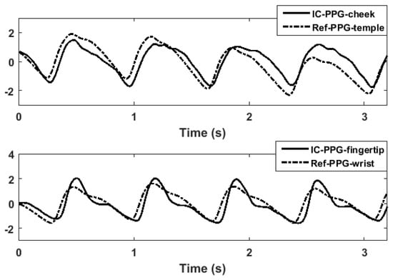 Figure 5 shows an example of a PPG signal produced by the ICPPG system and the corresponding reference signal. The morphologic difference observed in the figure might be caused by the difference of tissue where the PPG sensor was placed, or the difference in PPG sensing modalities. The sensitivity of the PPG morphologic difference and its influence on PTT measurement should be investigated in future work. From the figure, we found that the ICPPG signals and their reference signals showed the aligned periodicity. This indicates that the ICPPG system can reveal the same heartbeat as reference system does, which is in line with the previous finding that the facial color variation is related to the blood volume changes induced by heart pumping [].