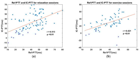 The correlation between IC-PTT and Ref-PTT for relaxation and exercise scenarios. (a) The correlation between IC-PTT and Ref-PTT of relaxation sessions; (b) The correlation between IC-PTT and Ref-PTT of exercise sessions.