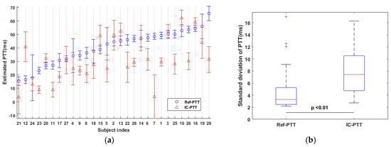 Note that the PPG waveforms with a low signal quality (evaluated by the metric proposed by Li et al. []) were excluded. As a result, 8.8 ± 4.8% (minimum: 3.5%; maximum: 22%) of Ref-PTT values were excluded, and 9.8 ± 8.9% (minimum: 3.6%; maximum: 40%) of IC-PTT values were excluded.