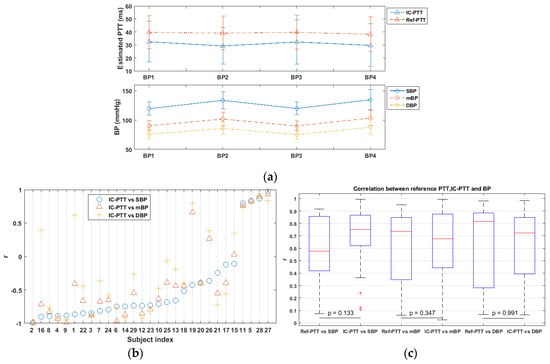 Correlation between IC-PTT (and Ref-PTT) and BP. (a) PTT (both IC-PTT and Ref-PTT) varied with BP (systolic BP (SBP), diastolic BP (DBP), and mean BP (mBP)) over time during the experiment; (b) Correlation coefficient between IC-PTT, SBP, DBP, and mBP per subject; (c) The absolute correlations coefficient between IC-PTT and BP (SBP, DBP, and mBP) and that between Ref-PTT and BP (SBP, DBP, and mBP).
