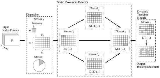 Once the Dispatcher module has partitioned the current frame F into , and distributed the work load to all next level working threads, the Static Movement Detector module performs all major tasks to detect and track movements on a frame-by-frame basis. This means that all threads belonging to this module essentially work without memory, i.e., they analyze single video frames without considering any correlation among them. To be more precise, the module encompasses the following operations.