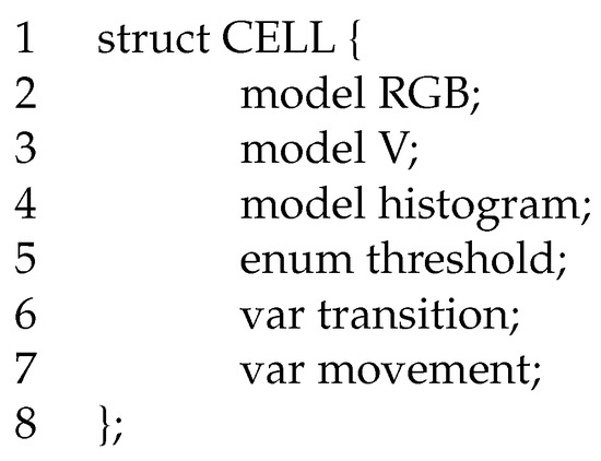 To allow some sort of data sharing among the different steps of the algorithm, we associate to each cell an abstract data type (ADT) structure with the data fields reported in Figure 2. We will consider ADT as globally visible or eventually embedded in a class object, with proper synchronization access primitives on all setter and getter methods. All fields will be described in the following sub-sections, but essentially they store the coming data. The first two fields of Figure 2, RGB and a V (lines 2–3), are internal data structures, representing the RGB channel and the V channel of the HSV background model (see Section 4.1).