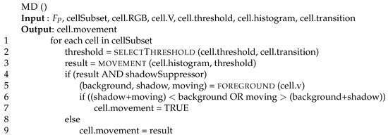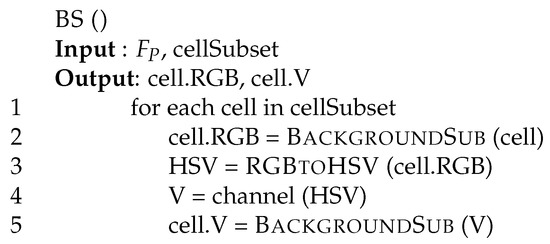 From line 3 on, following Cucchiara et al. [4] and Leone et al. [5], we implement a shadow detector performing background subtraction on the V channel of the HSV coding [38,39,40]. Usually, for efficiency reasons, the shadow suppressor is activated only on cells where the luminosity level allows shadows to be present, i.e., not on too dark or too clear cells. This means that for the V model, we automatically update only the background model, whereas the foreground is updated only on request (lines 3–5). Function BS finally returns the RGB and the V background models for the cells (namely, fields cell. RGB and cell. V of Figure 2).