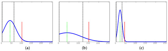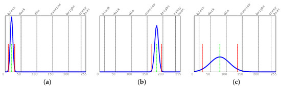 Gray histograms for: (a) a uniform dark cell, (b) a uniform bright cell, (c) a non-uniform dark cell. Vertical lines represent average (green) and variance (red) on all bins.