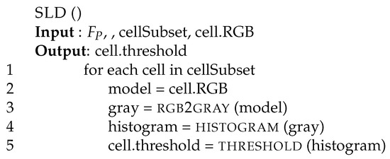 Figure 5 reports the pseudo-code dividing cells into classes based on their static luminosity. The procedure receives as input the video frame , the sub-set of cells to manipulate (cellSubset), and the cell RGB model (cell.RGB) computed by function BS. It produces for each cell a gray histogram and a luminosity threshold level as follows. Function SLD converts the RGB representation of the background into a gray scale (line 4). The gray value is an integer value (in the range ) representing the pixel gray level. Then, it builds a gray histogram for each cell (stored in the local variable histogram) where each bin represents the number of pixels (out of ) with the same gray tone. At the same time, as the histogram may be represented as a discrete Gaussian curve, it computes its average and variance values. Those values are then used to divide cells into classes of isomorphic luminosity (line 6).