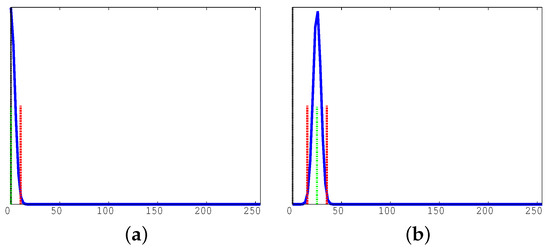 As described by Boreczk et al. [33], the histogram of the difference between the current RGB pixel value and the model computed during the background subtraction phase can be used by module DLD to detect dynamic luminosity changes. Unfortunately, when there are rapid and uniform changes in luminosity those changes can generate false movement detections. To avoid false detection, Figure 6 illustrates how the histogram behaves when there is a rapid luminosity transition without any foreground movements. Figure 6a shows cases in which there are no notable alterations of the background, whereas Figure 6b represents a situation in which there is a rapid luminosity change. The average value is larger for more abrupt changes. Notice that when the transient DLD histogram response is finished and we are back to a steady state, the histogram configuration moves back to the one of Figure 6a. During the transitional period the module DLD essentially issues a warning on the cell or set a timer to a specific value indicating that movements have to be evaluated after a few frames with larger thresholds.