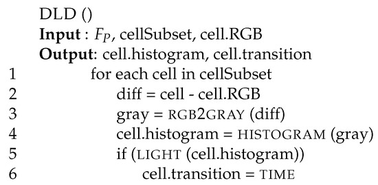 Figure 7 reports the pseudo-code of our implementation of the DLD module. The procedure receives as input the video frame, the sub-set of cells it has to manipulate, and the RGB model for each cell (cell.RGB). For each cell, it computes the difference between the RBG representation of each pixel of the current video frame and the representation of the background model (line 2). After that, it converts the previous difference (diff) into gray tones (gray, line 3) using function rgb2gray. The gray tones are integer values included in the range. After that, it computes the histogram of such differences (line 4) using function histogram [41]. Finally, if this histogram stores any value larger than 0 in the first 5 bins (function light, line 5), the procedure sets the transition field of that cell (cell.transition) equal to the integer value time (line 6). This indicates that the cell is in a transient luminosity condition.