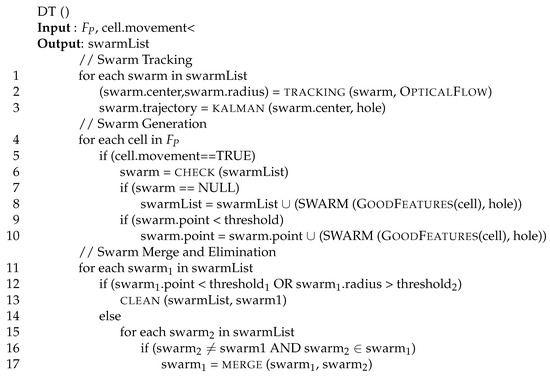 In the first section of the algorithm (lines 1–3) we track existing swarms. Every swarm already present in the current image (line 1) is tracked using function OpticalFlow (line 2) derived from [34,35,36,37]. For each swarm, the centroid of all points and the radius of the circle including those points are computed and assigned to fields center and radius of the swarm by function tracking. The average point of each swarm is used to track the swarm itself, using a Kalman filter [42] (line 3).