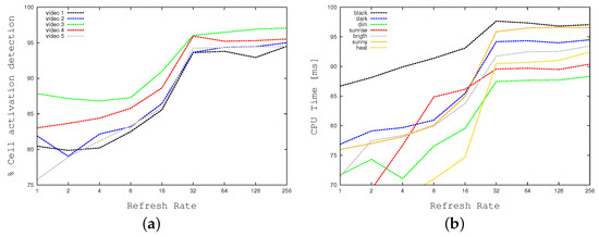 Figure 18 and Figure 19 demonstrate the impact of our divide-and-conquer strategy in terms of time efficiency. Figure 18 plots the wall-clock times required by our application when running on the embedded system in sequential mode (i.e., with multi-threading disabled) as a function of the refreshing rate. As before, all CPU times are expressed in milliseconds. Figure 18a concentrates on standard weather conditions, whereas Figure 18b focuses on more adverse weather conditions, and crowded contexts, requiring larger times. The two graphs prove that the divide-and-conquer strategy may reduce elapsed times by a factor of 2. As previously described, to obtain the right balance between time efficiency and detection accuracy, we selected a refresh rate equal to 32 cells per frame. Figure 19a compares our tool using this refreshing rate with the highest possible one. The graph shows a gain of a factor of about 2. Figure 19b relates wall clock-times of the multi-threaded implementation with the ones of the sequential version, both of them running with a refresh rate of 32. The concurrent version (running 5 threads) is about two times faster on average.