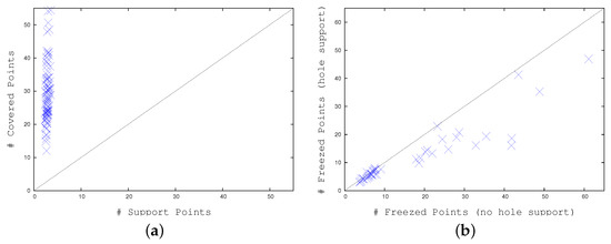 (a) Number of support points versus number of base movement tracking algorithm (BMTA)-represented points by a single swarm. (b) Number of frozen points with no hole support versus number of frozen points with hole support.