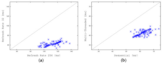 Comparing computation times on the embedded system: (a) The sequential implementation with two different refresh rates, and (b) The multi-threaded version versus the sequential one.