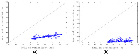 Finally, Figure 20 compares BMTA with our multi-threaded strategy with the selected cell size and refreshing rate. In Figure 20a the reference version runs on the desktop workstation whereas our implementation runs on the embedded system. Our implementation proved to be about times faster. In Figure 20b both the reference and our tool run on the desktop workstation. In this case, representing the final apple-to-apple comparison, our implementation is about 4–5 times faster. This definitely enables run-times embedded applications.