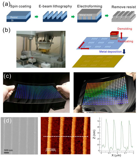 (a) The fabrication process for Ni–Co mold; (b) the homemade hot-embossing machine for rapidly generating arrays of nanostructures on an A4 size plastic film; (c) the optical image of the replicated nanostructure (left) and capped aluminum nanoslit arrays (right) on an A4 size polycarbonate film. There are 416 arrays and the area of each periodic nanostructure is 5 × 5 mm2; (d) the SEM (left), AFM (middle), and cross-sectional profile (right) of the capped aluminum nanoslits.