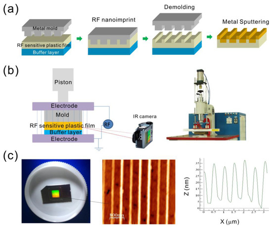 Figure 2a shows the fabrication process for fabricating nanostructures using the dielectric-heating nanoimprinting method, which consists of three steps: dielectric-heating, molding/demolding and sputtering of a metallic thin film. Dielectric-heating is an electronic heating process using a high-frequency alternating electric field to heat a dielectric material. In our method, we used a commercial RF welding machine (HG-501S, Hexagon Electric Industrial Co., Taiwan) operated at 27.12 MHz. The RF-heating system is shown in Figure 2b. At this RF frequency, the molecular dipole rotation within certain polymers will cause very rapid heating. The widely used polymers for RF heating include PVC (polyvinylchloride), polyamides (PA), nylon, PETG and some ABS (acrylonitrile butadiene styrene) plastics. In our experiment, we used PETG (Tg ~80 °C) as the RF-sensitive polymer. Compared to thermal heating, RF heating requires a moderate amount of energy. The fabrication parameters are RF power, RF-active time, and pressure. To reduce the heating time, the mold was preheated to a temperature below the Tg of the polymer. The preheating temperature was set at approximately 60 °C, and the heating power was 3.5 kW. The polymer film reached a temperature higher than the Tg. Applying pressure on the mold embossed the nanopatterns onto the softened polymer film for several seconds. The temperature of RF-sensitive polymers was monitored using an infrared thermometer. It increased approximately 30 °C within 9 s. This indicates that RF can induce molecular vibrations, and generate heat in RF-sensitive polymers in a short time. The temperature in the RF-sensitive polymer rapidly decreased when the RF power was turned off. The mold and the polymer substrate can be easily separated soon after dielectric-heating. The nanostructures can be rapidly replicated, and the mold can be used repeatedly. After evaporating a metallic film with a thickness of 50 nm on the imprinted polymer substrates, the capped metallic nanoslit arrays were produced. Figure 2c shows the optical, AFM and cross-sectional images of the capped aluminum nanoslits with a ridge height of 30 nm.