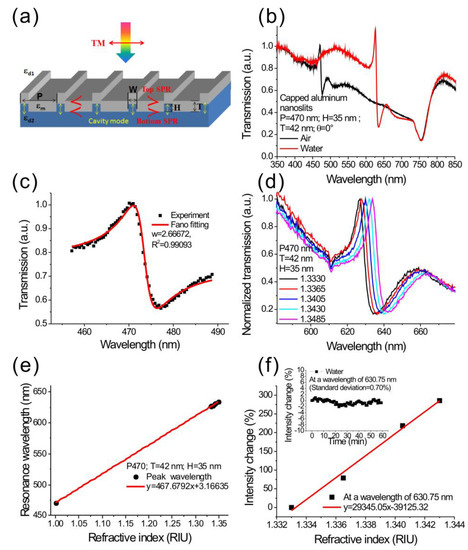 Figure 3a shows the geometrical parameters of capped aluminum nanoslits and the polarization direction of incident light. Figure 3b shows the measured transmission spectra in air and water for normally incident TM-polarized light. The parameters for capped aluminum nanoslits were H = 35 nm, T = 42 nm, W = 60 nm, and P = 470 nm. The sample was made using the rapid hot-embossing method. A clear Fano resonance was found in the spectrum. The Fano resonance comes from the couplings between cavity resonance within metallic nanoslits, and SPR modes on the periodic metallic surface (the aluminum/medium and aluminum/substrate interfaces). The gap plasmons within the nanoslits had a broadband transmission due to the Fabry–Perot effect [36],