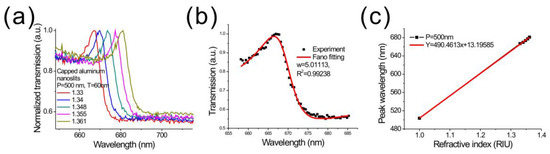 (a) The transmission spectra of the capped aluminum nanoslits with various water/glycerin mixtures. The sample was made by using dielectric-heating method; (b) the Breit–Wigner–Fano fitting of the Fano resonance; (c) the peak wavelength shift against the refractive index of medium for the nanostructure. The wavelength sensitivity was 490.46 nm/RIU.