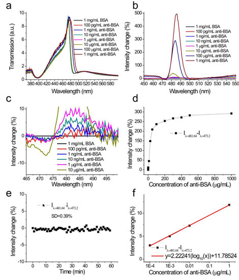 (a) The measured transmission spectra in 1 mg/mL bovine serum albumin (BSA) and different concentrations of anti-BSA solutions from 100 pg/mL to 1 mg/mL; (b) the spectral intensity changes caused by different concentrations of anti-BSA solutions. The transmission spectrum of the BSA solution was set as a reference; (c) the enlarged spectral intensity changes caused by different concentrations of anti-BSA solutions; (d) the intensity change difference (Idiff = ∆I/Iλ = 481.64−∆I/Iλ = 473.20) as a function of the concentration of anti-BSA; (e) the intensity change as a function of the logarithm of the logarithm of the concentration of the anti-BSA solution; (f) the intensity change (Iλ = 481−Iλ = 473) as a function of time.