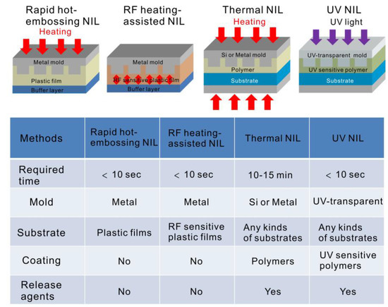 Comparison of various nanoimprinting methods.