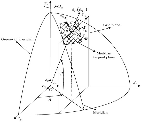 The navigation coordinate system of the grid SINS is grid coordinate system . As shown in Figure 1, when the ship moves to the point P, the grid coordinate system is defined as follows: Grid plane: the parallel plane of the Greenwich plane which passes through the point P; Meridian tangent plane: local horizontal plane which passes through the point P. The grid north axis is the intersecting line of the grid plane and meridian tangent plane. The grid up axis coincides with the up axis of the geographic coordinate system which passes through the point P. Grid east axis lies in the local horizontal plane and is perpendicular to the grid north axis. , , and constitute the right-handed coordinate system. Obviously, the grid coordinate system is a local horizontal coordinate system, and is used as the reference of the grid course angle.