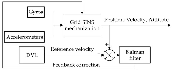Based on the optimal estimation theory and feedback correction technology, the schematic diagram of the KF-DGSINS is shown in Figure 2. As shown in Figure 2, gyroscopes and accelerometers measure the angular motion and linear motion of the ship, respectively, and the position, velocity, and the attitude of the ship are calculated through the grid SINS mechanization. The system error states are estimated by Kalman filter with the aid of a reference velocity measured by DVL, and then the Schuler oscillation errors can be effectively suppressed by correcting some error states of the Kalman filter. This section first introduces the error model of the marine grid SINS, then the Kalman filtering and feedback correction technology are described in detail.