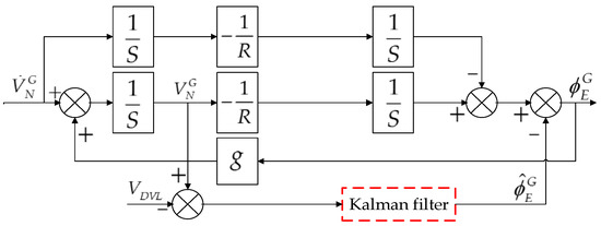 Two correction methods are usually used to calibrate the system: one is feedback correction and the other is output correction. Obviously, if output correction is selected, only the oscillation errors of the grid level attitude angles can be suppressed, as a result of the system’s open-loop structure. Feedback correction is the suitable way to calibrate the system for this method, and can suppress not only the oscillation errors of the grid level attitude angles, but also the oscillation errors of the grid level velocity and position. In fact, the existence of the level attitude error angles is the essential reason for the Schuler periodic oscillation, so the Schuler oscillation errors can be suppressed effectively through the feedback correction. Here we take the grid north level circuit as an example and the block diagram of the KF-DGSINS algorithm is shown in Figure 3. In Figure 3, represents the variable after the Laplace transformation, and means the integration process. represents the radius of the earth. represents the estimate of the grid east attitude error angle.
