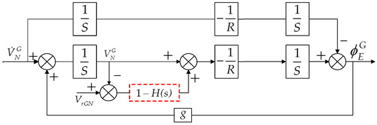 Referring to the traditional external level damping algorithm based on the damping network of common SINS, the T-DGSINS based on classical control theory can be designed. Taking the grid north level circuit as an example, the block diagram of the T-DGSINS is shown in Figure 4. The external reference velocity is introduced to the system through the damping network , from the physical sense, the introduction of the external reference velocity just adds a compensation channel to the system, and the navigation accuracy of this method is sensitive to the error of the external reference velocity.
