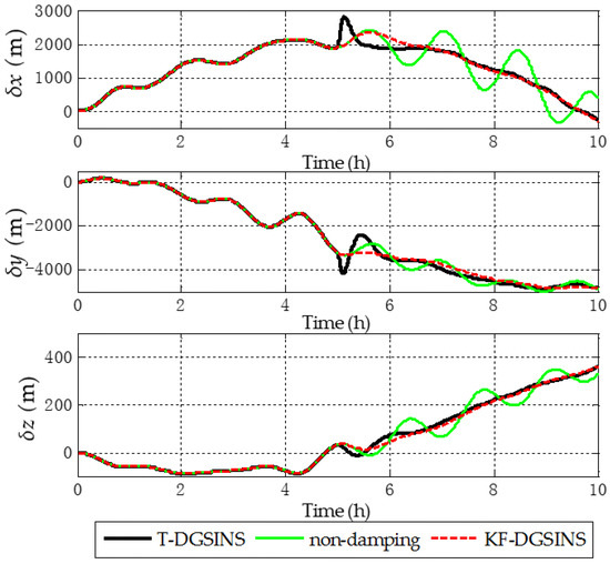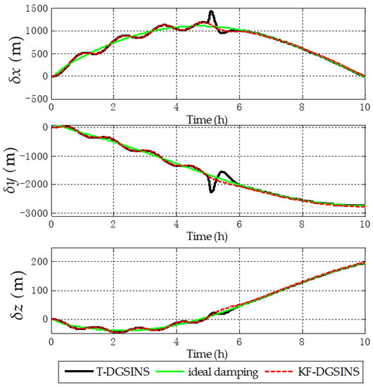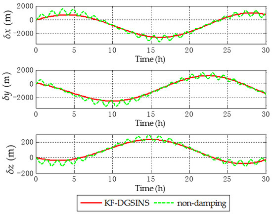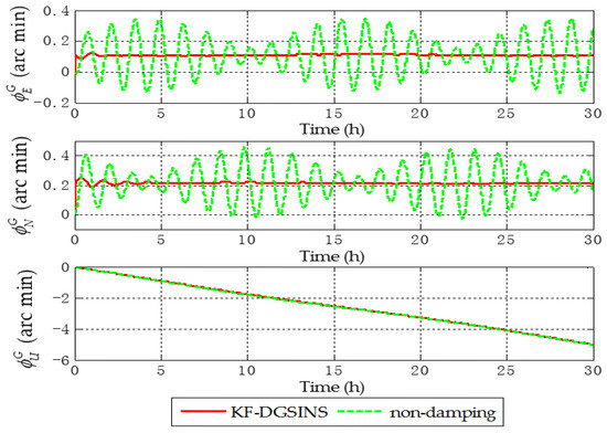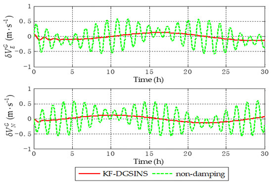 Aiming at the grid SINS, in order to test the damping performance of the KF-DGSINS, non-damping grid SINS and KF-DGSINS are simulated on a stationary base. Gyroscopic and accelerometer outputs are generated by the track generator. The general idea of the track generator is: according to the change rules of the carrier’s position, velocity, attitude, and the settings of the IMU error, the outputs of the gyroscope and accelerometer can be back-stepped through the SINS mechanization. The simulation conditions are set as follows: simulation lasts 30 h; the initial latitude and longitude are and ; the three-axis gyro constant drifts are set as 0.003 degree per hour and the three-axis accelerometer constant biases are set as 0.00005 , and the random error of the gyro and accelerometer are set as white noise; the error of the external reference velocity is set as white noise. The simulation results are shown in Figure 5, Figure 6 and Figure 7.
