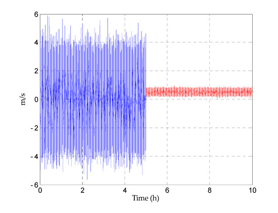In practice, the velocity measured by DVL is unavailable when the ship maneuvers or sails in some special sea areas. When the ship sails in a steady state, according to the previous introduction, the error of the DVL can be simplified as a constant, and the velocity measured by DVL is available. Considering the practical situation, the errors of the grid east and north velocity can be set as follows: before , the velocity measured by DVL is set to be unavailable. In order to simulate the condition that the error of the external reference velocity changes dramatically, the errors are set as the zero mean white noise with large amplitudes; after , the velocity measured by DVL is set to be available, and the error model of the velocity measured by DVL is simplified as the constant. In this case, the errors are set as the sum of the white noise and the constant (1kn). Taking the error of the grid east reference velocity as an example, the error of the grid east reference velocity is shown in Figure 8. When the reference velocity error is set as zero, the results of the T-DGSINS represent the ideal damping results of the grid SINS. In this way, in order to better reflect the advantage of the proposed KF-DGSINS, the ideal damping results are given when the reference velocity error is set as zero from beginning to end. The simulation results are shown in Figure 9, Figure 10 and Figure 11.
