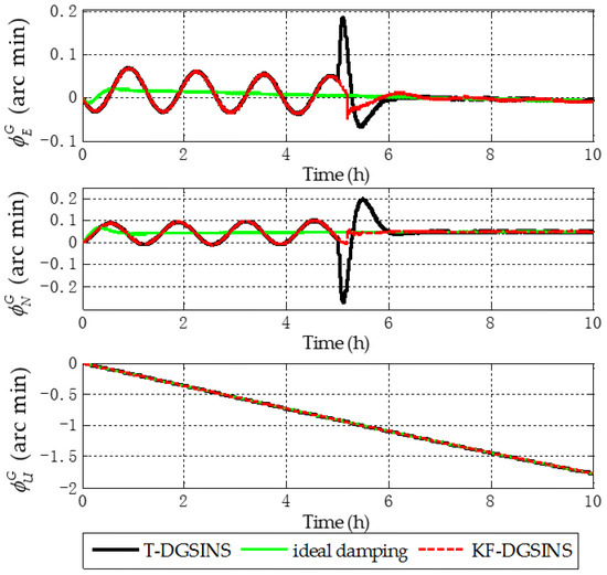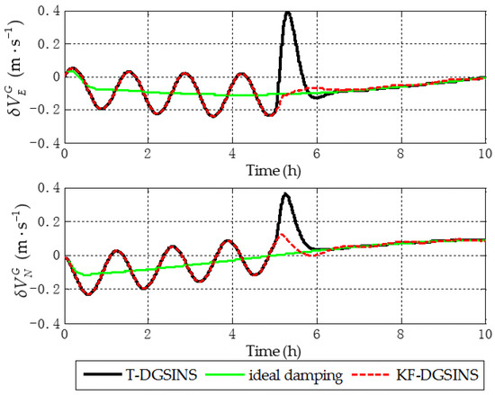 When the state of grid SINS is switched from the non-damping state to the external level damping state, big overshoot errors are introduced to the system by using the T-DGSINS. The KF-DGSINS proposed in this paper can restrain the overshoot errors effectively. In order to verify the advantage of the KF-DGSINS, the T-DGSINS and the KF-DGSINS are simulated under the same conditions. The simulation conditions are set as follows: gyro and accelerometer outputs are generated by the track generator; simulation lasts 10 h; the initial latitude and longitude are and ; the ship sails eastward along the latitude circle and the velocity is 10 m/s; the swing of the ship is set as the sine function:
