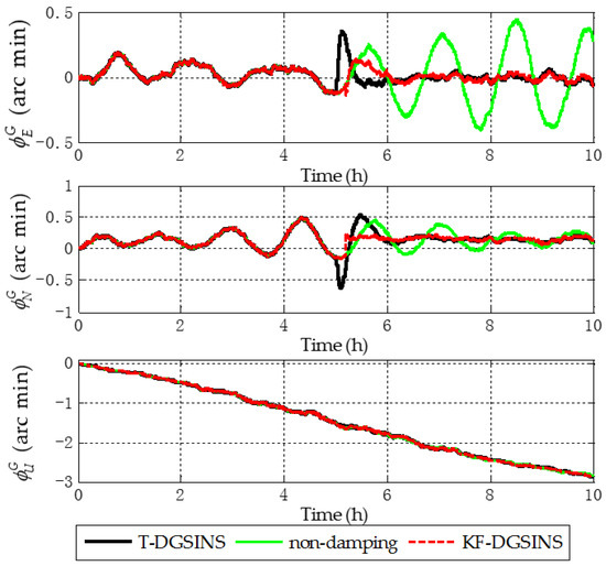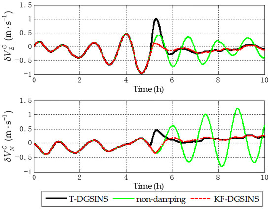 The solid green line is the ideal damping error curve of the grid SINS; the solid black line is the error curve of the grid SINS, adopting the T-DGSINS; the dotted red line is the error curve of the grid SINS, adopting the KF-DGSINS. Before , the error of the reference velocity changes dramatically. According to the criterion which is introduced in Section 3.2, the external reference velocity cannot be used. Therefore, the grid SINS works in the non-damping state; after , the external reference velocity changes slightly. According to the criterion, the external reference velocity becomes available, therefore, the grid SINS works in an external level damping state. What needs to be stressed is that the feedback correction should start after the process of Kalman filtering becomes stable. Some conclusions can be made from the simulation results: (1) two kinds of algorithm can effectively suppress the Schuler oscillation errors, and in the state switching process, the overshoot errors of the KF-DGSINS are obviously smaller than the overshoot errors of the T-DGSINS. For T-DGSINS, when the state of system is switched from the non-damping state to the external level damping state, the damping network is added to the level circuit of the grid SINS, and an equivalent step-function signal is introduced to the system. In this case, the equilibrium state of the system is broken, and the overshoot phenomenon occurs. For KF-DGSINS, no damping network is added to the system. When the Kalman filter is stable, the feedback correction of the grid level attitude error angles can suppress the Schuler oscillation error without breaking the equilibrium state of the system, and this is the reason why KF-DGSINS has a better performance in restraining the overshoot phenomenon than T-DGSINS; (2) the grid course angle error is hardly influenced by the overshoot phenomenon, therefore, T-DGSINS and KF-DGSINS achieved almost the same effect; (3) when the damping state is stable, the damping results of the KF-DGSINS and T-DGSINS are almost the same as the ideal damping results, which means the constant error of the external reference velocity will not affect the damping results of the KF-DGSINS and T-DGSINS when the damping state is stable. In a word, compared with the T-DGSINS, the KF-DGSINS has a better performance in overcoming the overshoot errors and this algorithm effectively improves the navigation accuracy of the grid SINS in the state switching process.