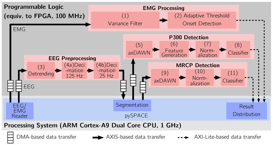 - Spatial Filtering: The axDAWN spatial filter [140] was applied to decrease the number of channels to four, creating a dimensional matrix. This operation can be realized as a matrix multiplication (using DSP48 [121] slices if realized in hardware) and was implemented using a specialized accelerator for matrix operations [152].