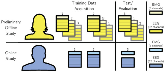 - Magma-Box Setup: In this setup, a Magma box with two Brain Products amplifier PCI cards were used, the first PCI card was used to acquire 128 channels of EEG, the second card to acquire 8 channels of EMG data. Electrodes I1, OI1h, OI2h, and I2 of the EEG were used for recording the electrooculogram, which is not considered in the following analysis. The Magma-Box setup was used for the offline evaluation and recording of the training data for the online evaluation.
