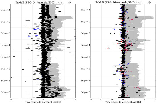 - P300 and MRCP or EMG (PaMoE): This combination is based on the combinations MoE and PaM, i.e., we compute .