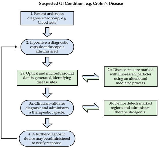 The proposed patient pathway (Figure 1) begins with a patient presenting with symptoms that indicate a GI condition, for example Crohn’s disease. In the next step, the patient is subjected to conventional diagnostic procedures and, if positive, a diagnostic CE device is administered that uses white light optics and μUS imaging to identify diseased regions in the GI tract after video review and quantitative US (QUS) analysis. The diseased regions are marked with fluorescent nanoparticles using a process analogous to UmTDD. At this stage, a clinician validates the diagnosis and can then apply TCE. The therapeutic device is designed to detect the fluorescent nanoparticle markers without the need for further diagnostic or communications functions, allowing space in the capsule for a reservoir of therapeutic agents, a release mechanism and US components to direct the agents towards the treatment site while simultaneously assisting in separating the active component of the agent, i.e., a drug, from a carrier, e.g., a microbubble, and increasing tissue permeability for enhanced uptake. Following delivery, further diagnostic CE could be used to assess therapeutic efficacy. Table 2 links the proposed patient pathway to current and future status of research described in this paper with relevant references highlighted.